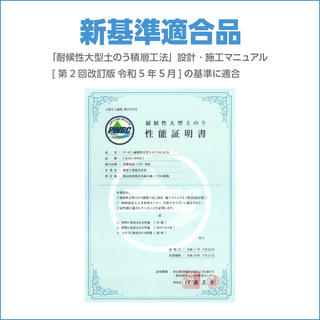 耐候性大型どのう積層工法」設計・施工マニュアル(一般財団法人土木研究センター)規定により設計・開発された土木専用の高耐候・高強度な大型土のうです。
