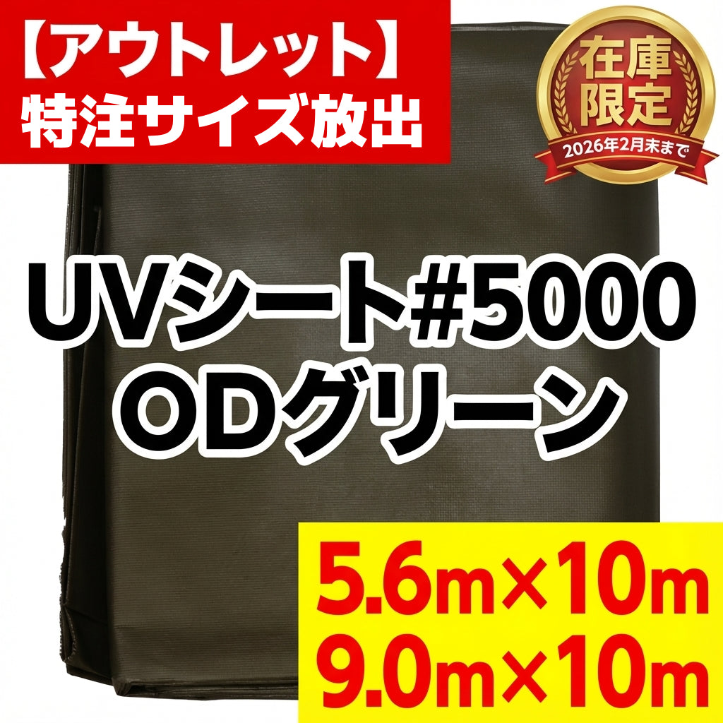 ハイグレード製品「ターピー UVシート#5000」の特注サイズ(ODグリーン)を、在庫調整のため特別価格でご提供いたします。
