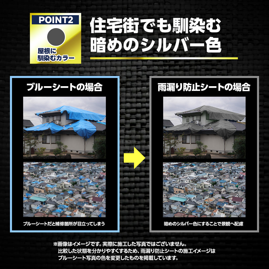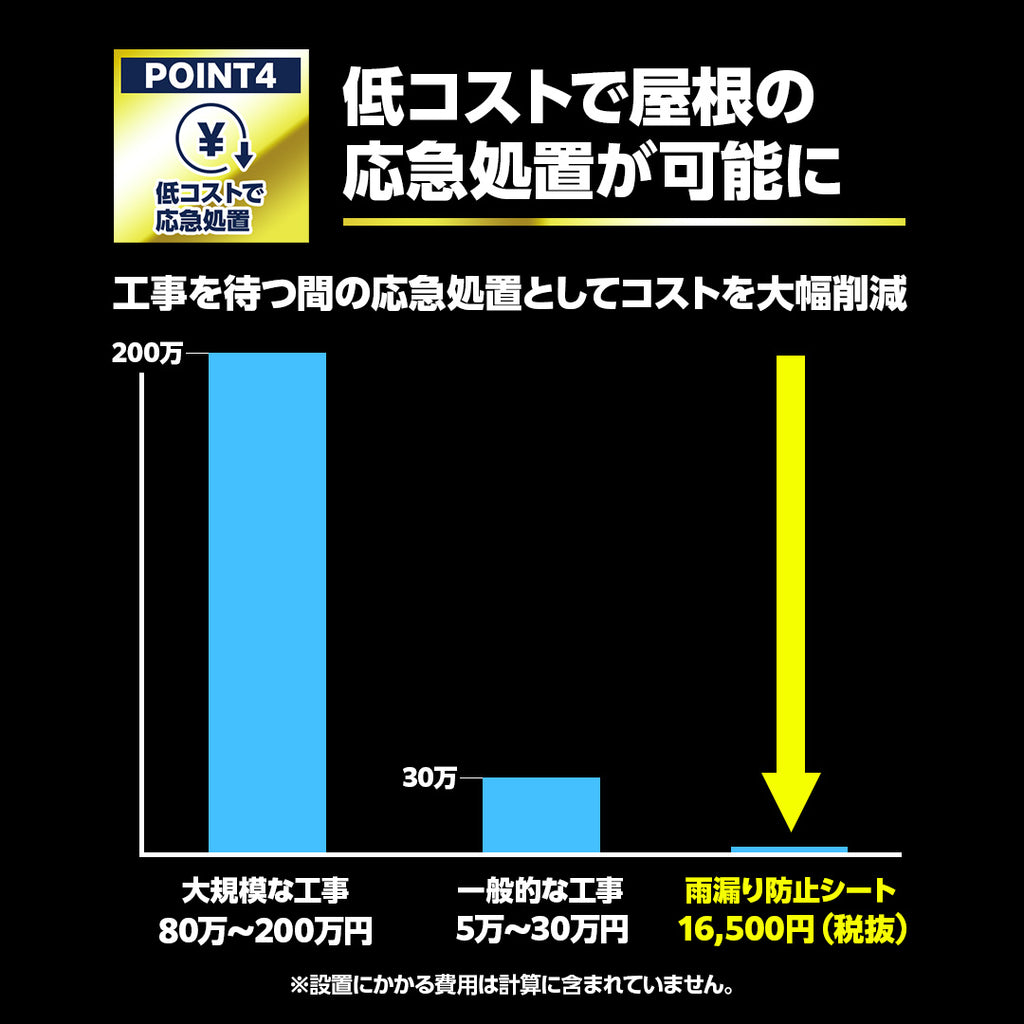 - 本製品は応急処置用のため、強風時にはシートが破損・飛散する恐れがございます。風が強くなる前に屋根から取り外し、安全を確保してください。