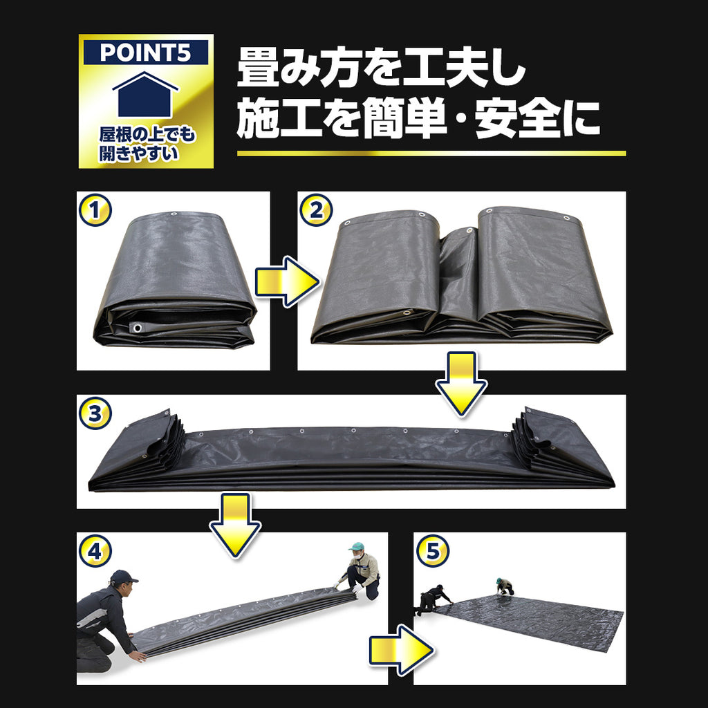 現場で役立つプロ仕様 屋根の上で広げやすいよう工夫された畳み方で、スムーズに作業できます。 |
