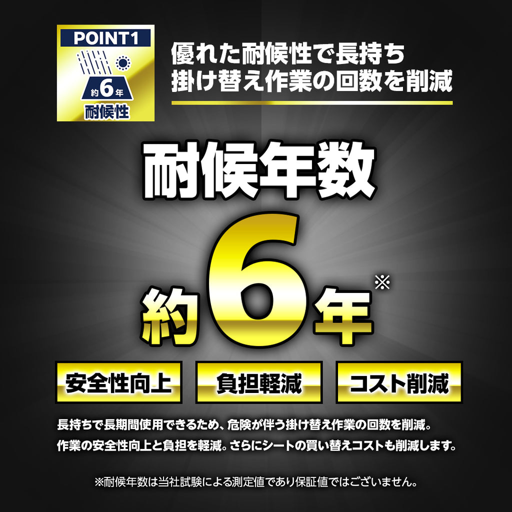 約6年の高耐候 紫外線劣化防止剤を配合した高耐候仕様。大切な家屋を長期間守ります。掛け替え回数を減らせて経済的です。 |