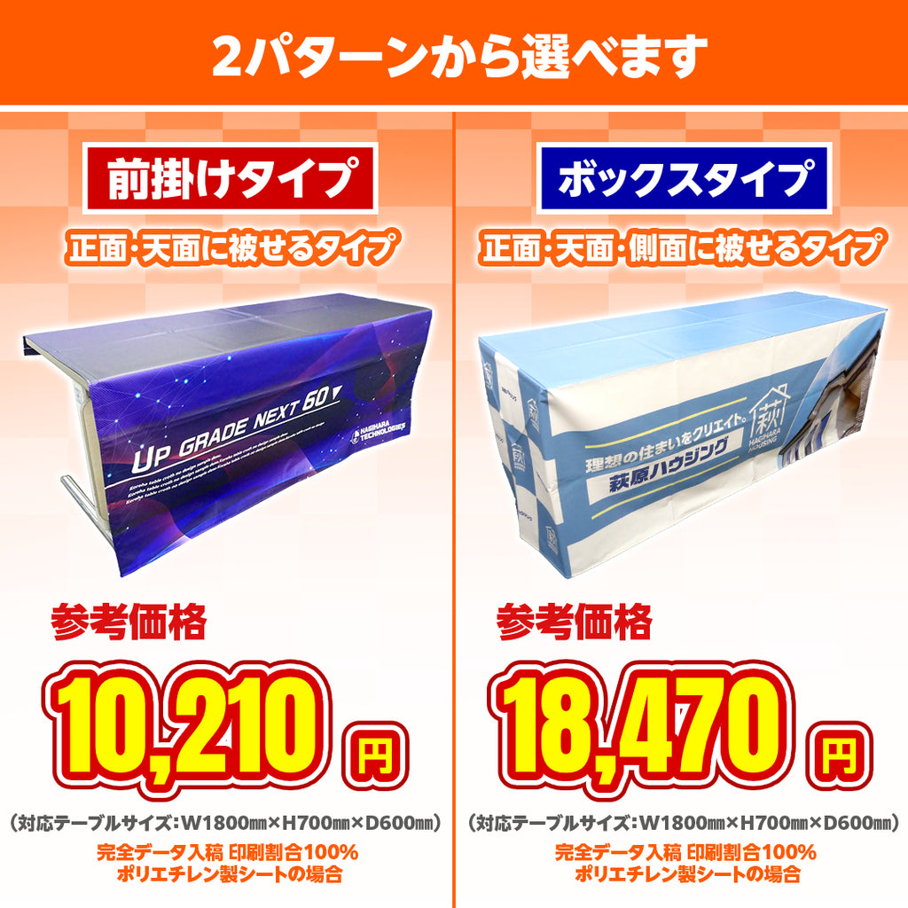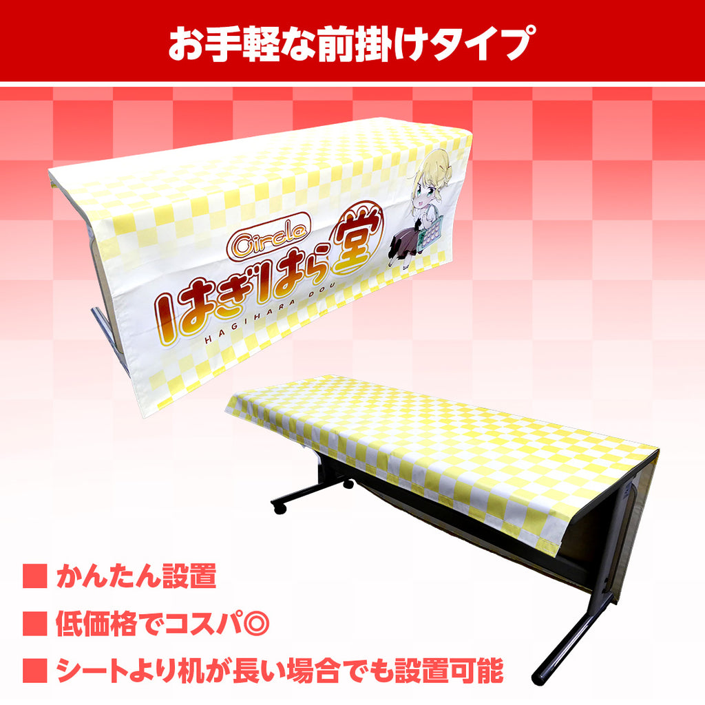 会社のロゴやイラスト、写真など、お好きなデザインでオリジナルのテーブルクロスを作成できます。展示会やイベント、説明会、即売会などのブースを華やかに演出し、来場者の視線を集めます。安心の防炎生地を使用し、1枚からご注文いただけます。