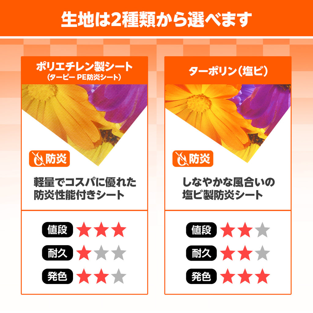 用途やこだわりに合わせて、2種類の防炎生地からお選びください。